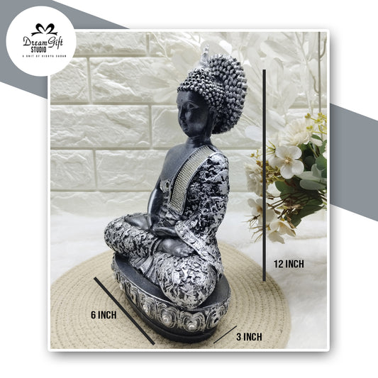 Silent Strength โ Black & Silver Resin Buddha with Aura and Elegant Detailing