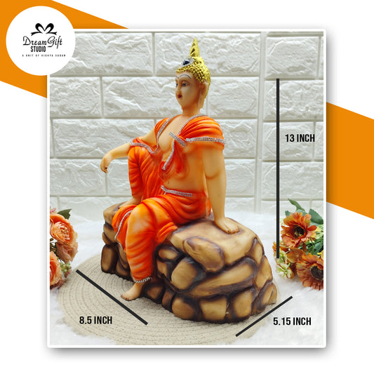 Grace of Wisdom โ Buddha Sitting on Stone in Orange Robes with Gold Foil Detailing