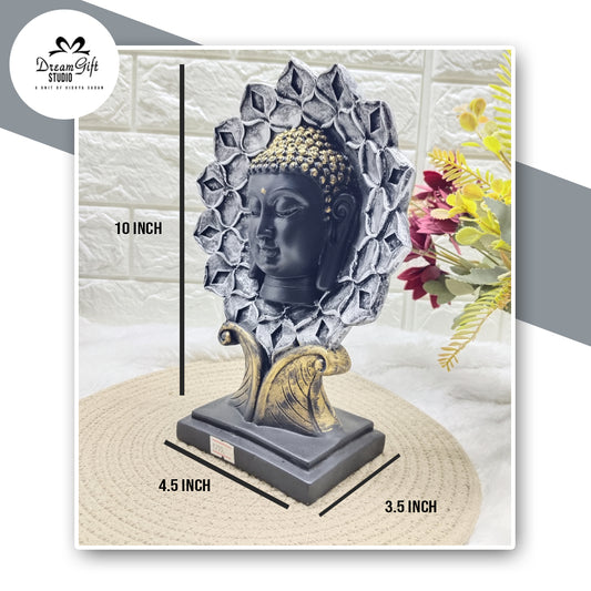 Divine Presence โ Buddha Face Resin Statue with Halo Aura Backdrop