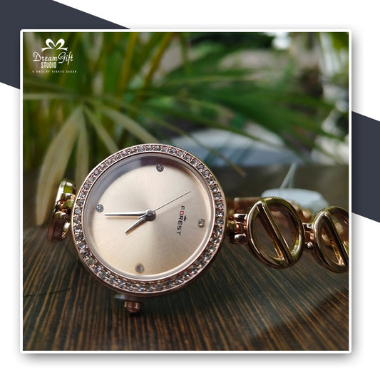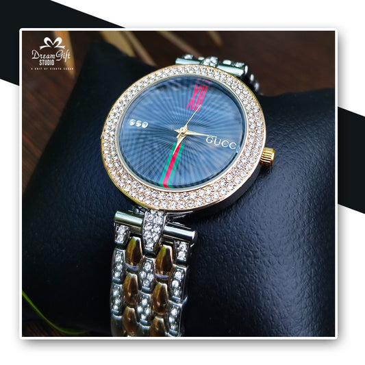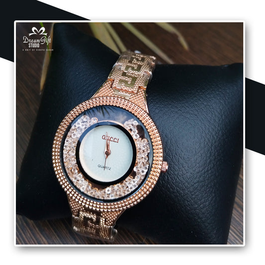 Gucci Style Elegant Rose Gold Chain Crystal Dial Watch For Her