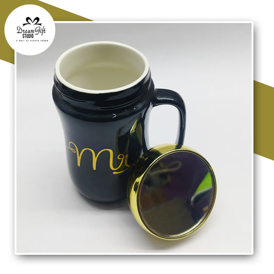 Stylish Red Tall Ceramic Mug with Mirror-Top Lid & Curved Handle