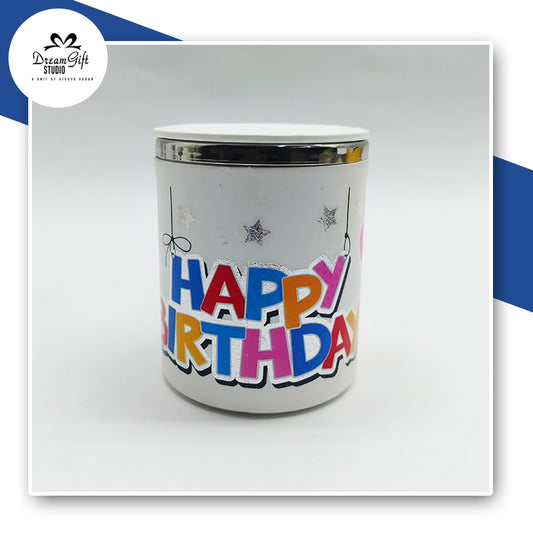 White Steel-Inner Mug with โHappy Birthdayโ Print & Closable Lid โ Gift Ready