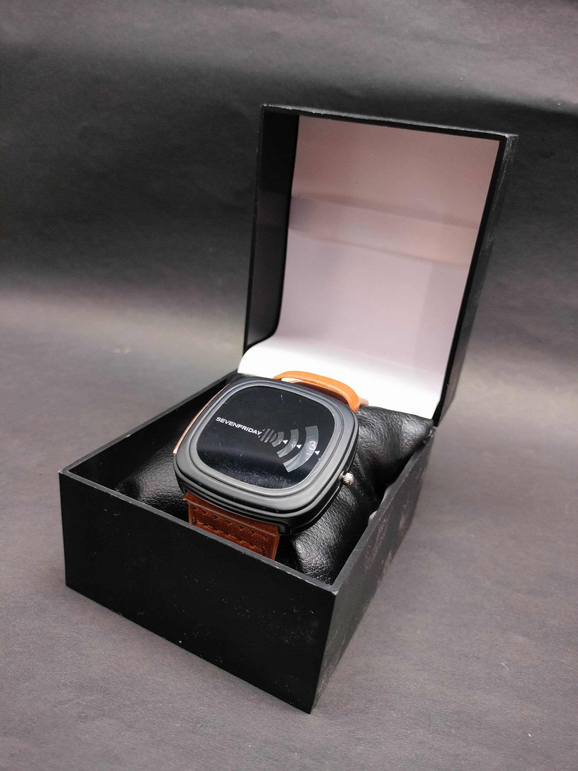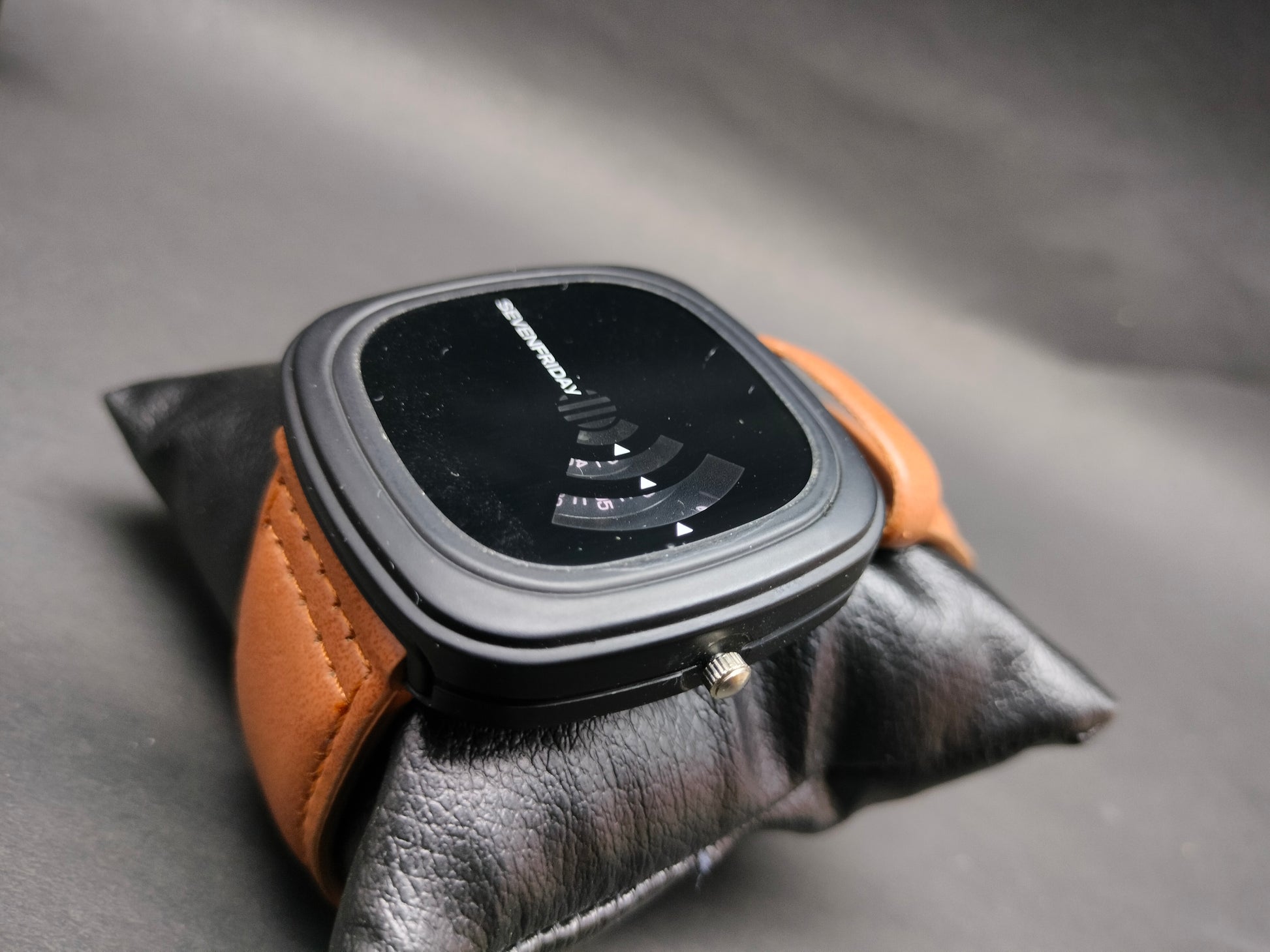 Futuristic Black Dial Watch with Layered Arcs and Premium Brown Leather Strap