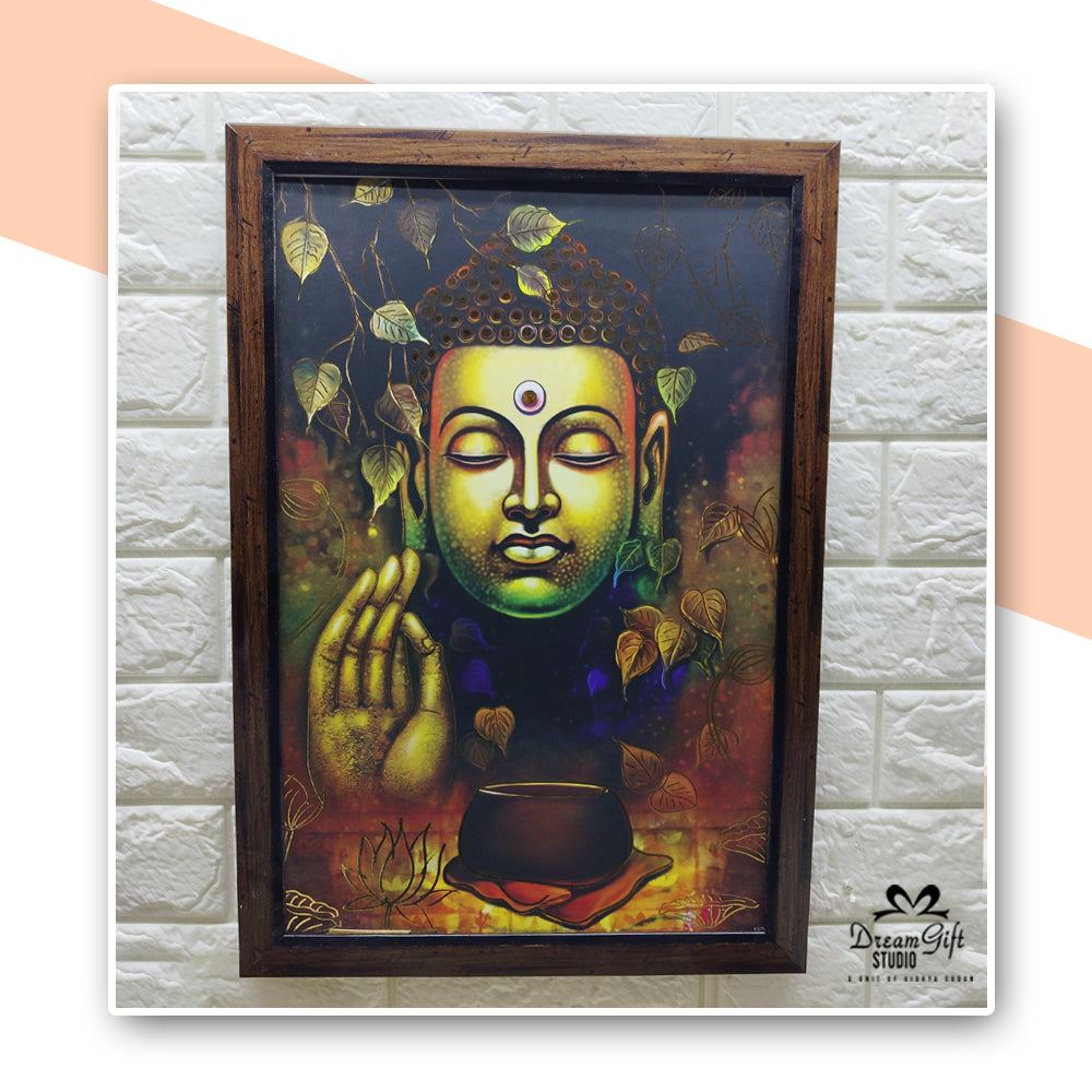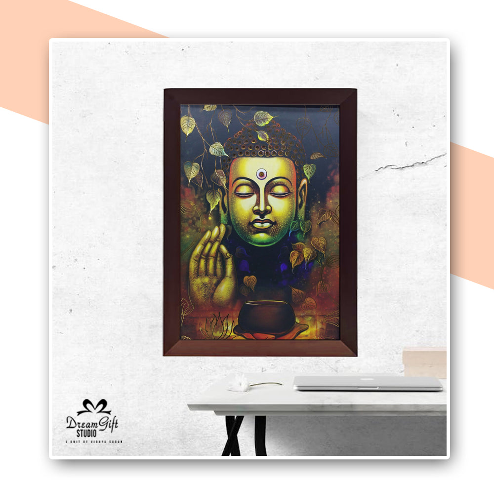 Golden Foil Serenity Buddha Wall Art Brown Frame | 14×20 inches