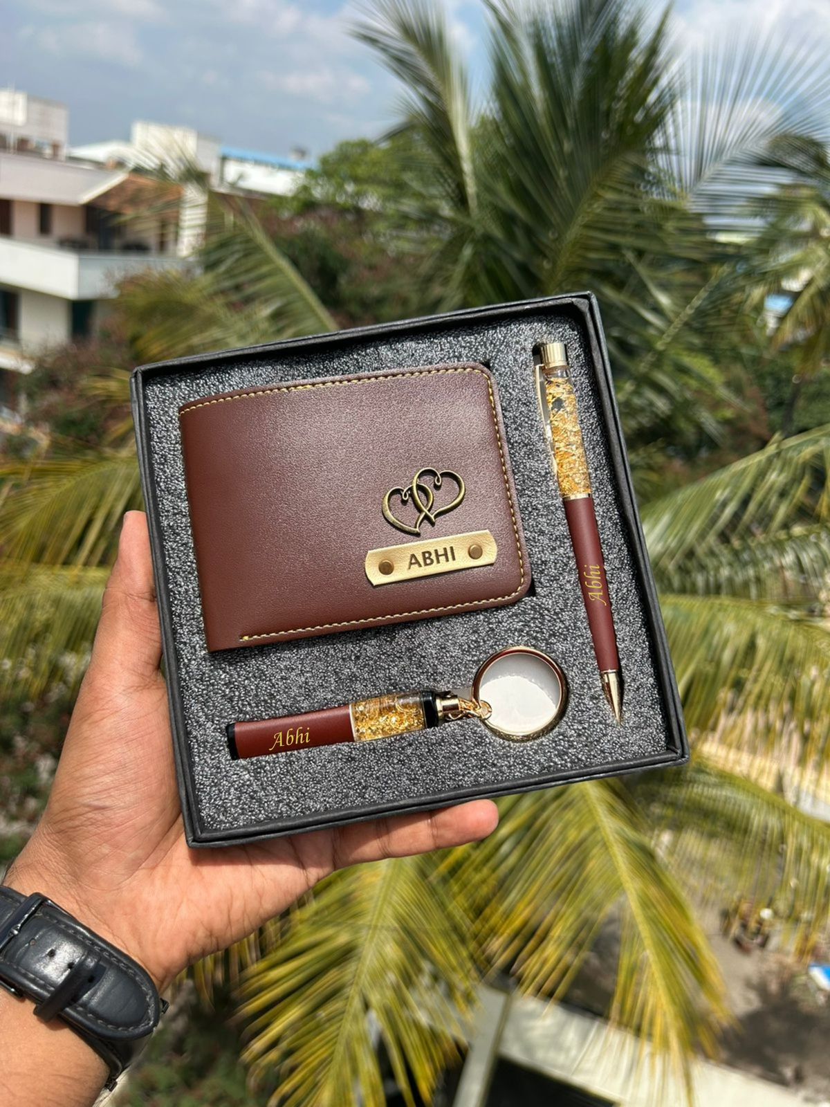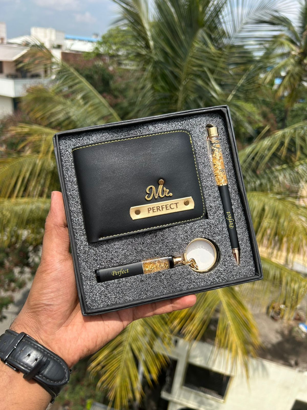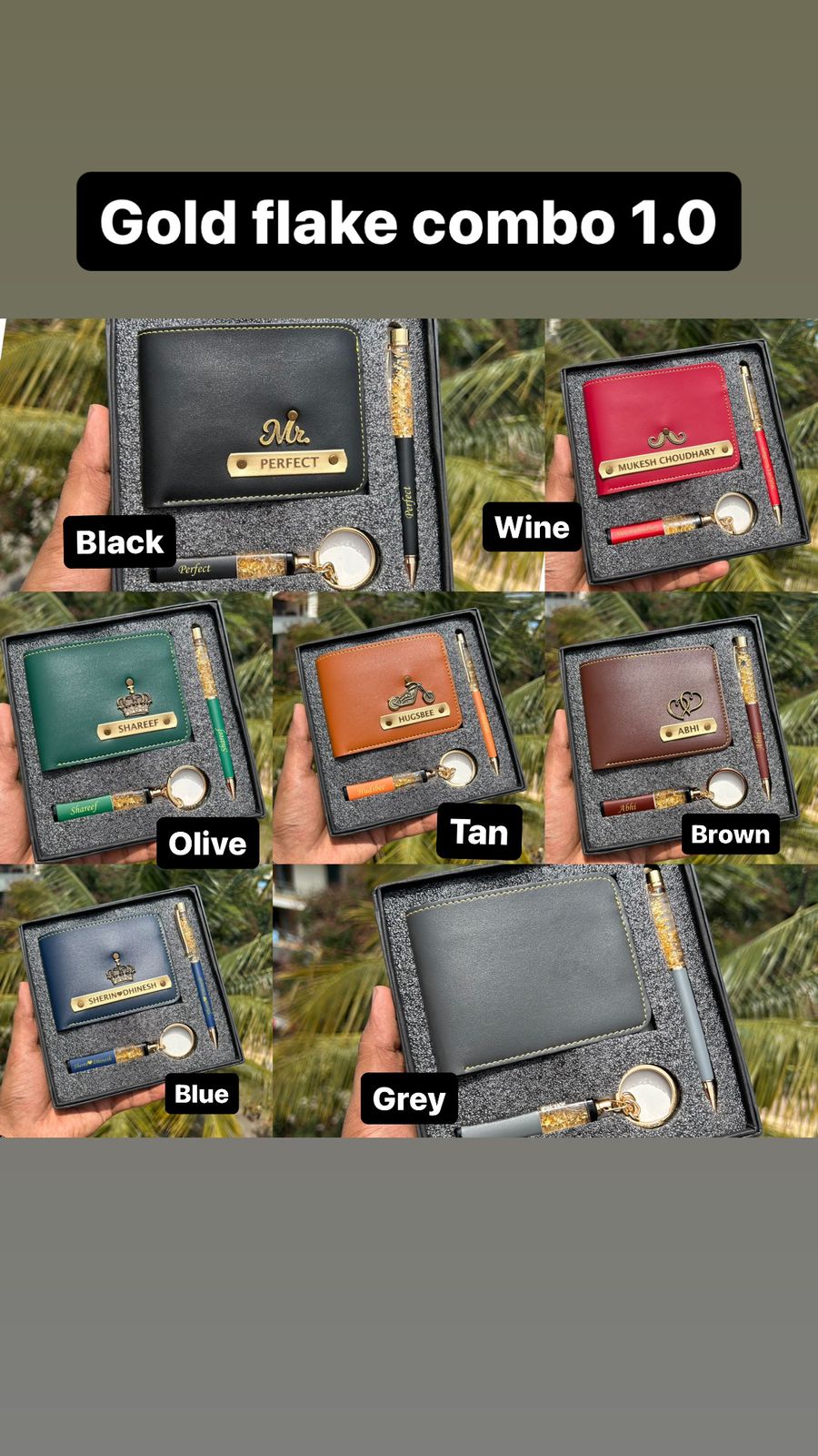 The Gold Flake Combo 1.0 is an excellent gift set that includes a men's wallet, a Gold Flake pen, and a Gold Flake keychain, all of which can be customized with a common name of your choice. The customizable feature adds a personal touch to the products, making it a perfect customized gift for your loved ones or colleagues.